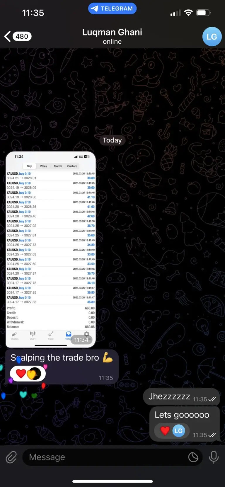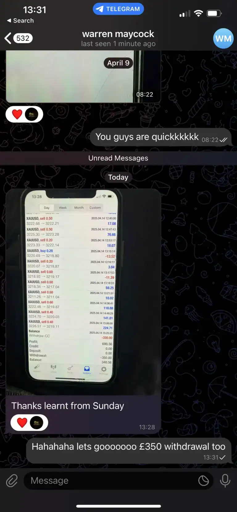 "Only started trading with Kay today and his experience in the markets along side his transparency makes understanding and placing his trades easy and quick so that everyone can make profit. I myself have already made a profit even though I only started today. Joining in on this will be the best decision you’ve made."