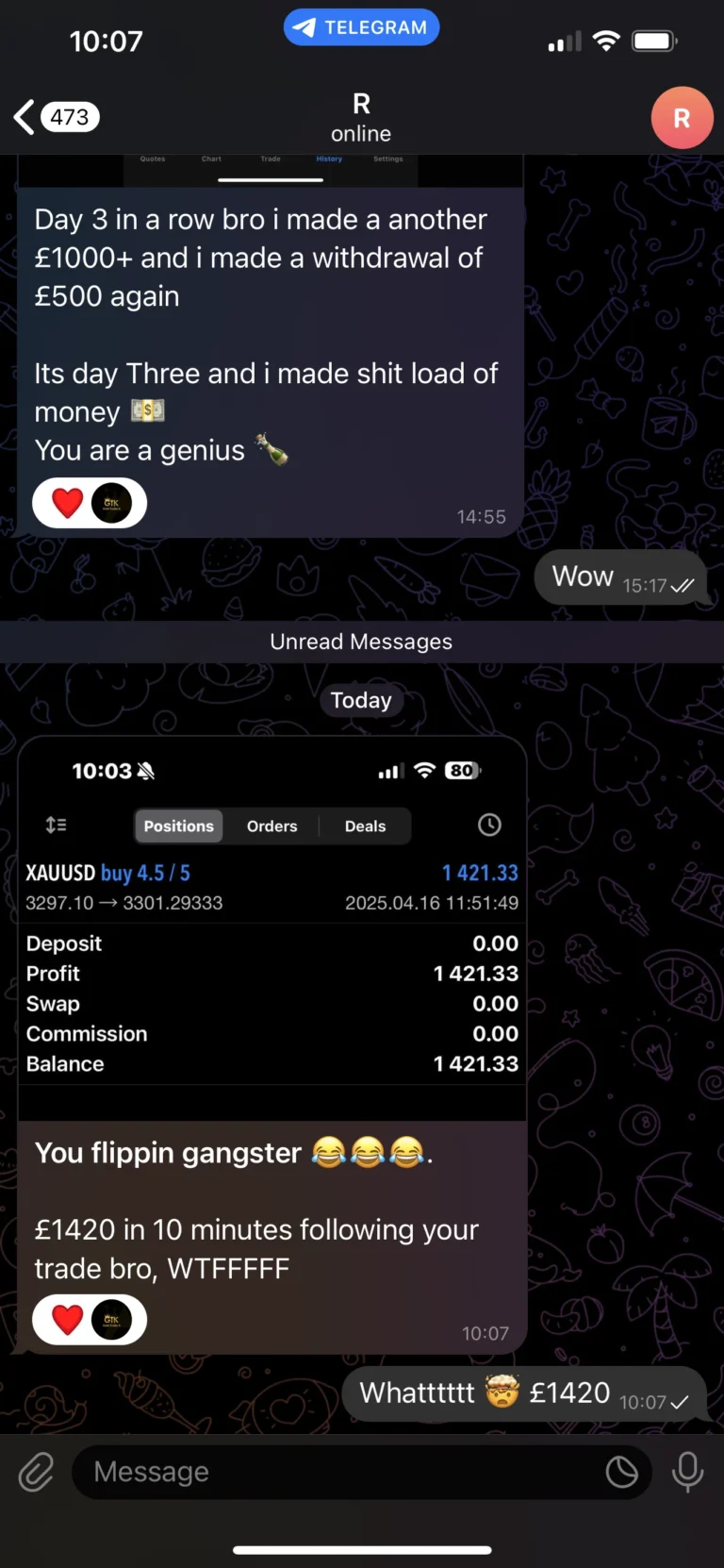"Absolutely fantastic trader that cares about people and their wins. He’s very active during the trade and guides us through every step of each trade daily. Provides daily analysis too which helps us gain knowledge and understanding of what we’re actually doing. Tried other traders and definitely sticking with this one!"